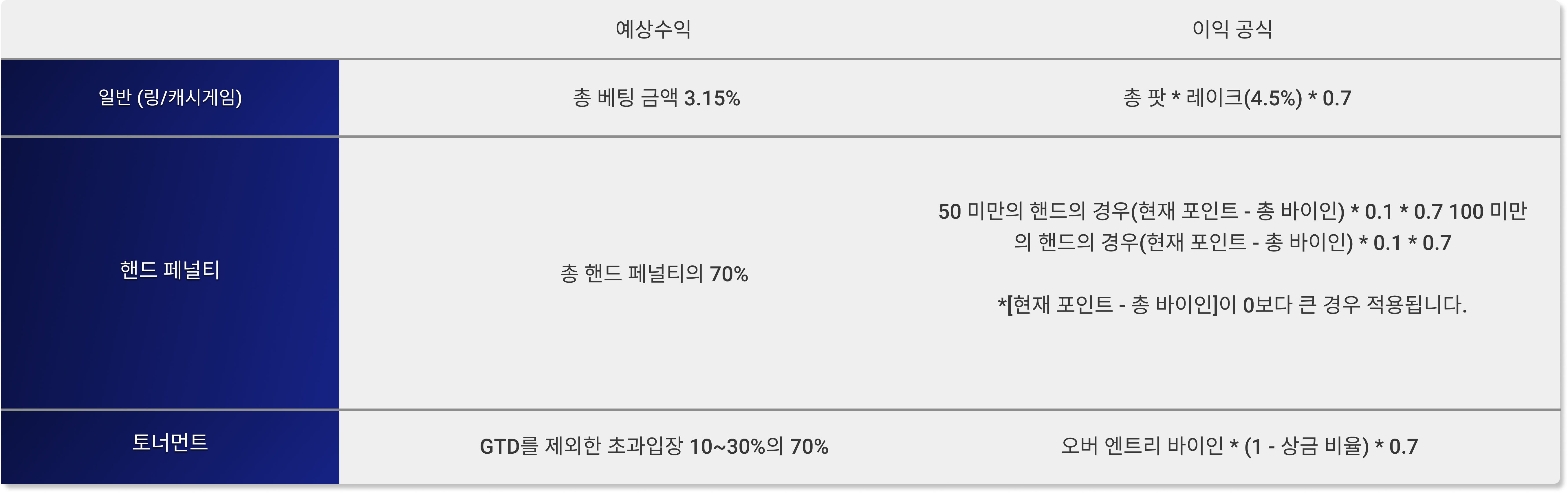 룸에서 플레이된 핸드 수가 50핸드 미만일 경우 15%의 페널티가 적용되며(바이인 금액 제외), 100핸드 미만일 경우에는 10%가 차감됩니다.